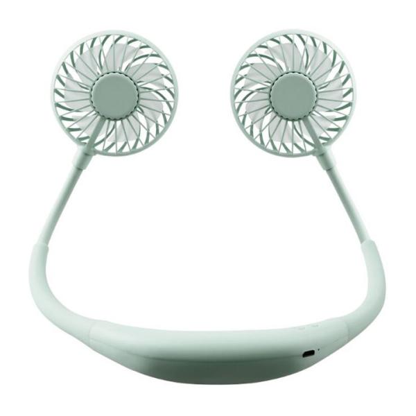 The portable fan has two wind head, can feel more powerful airflow, you can wear it on your neck and also can put it on the desktop.